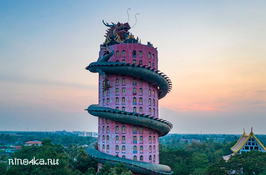 Внутри дракона находится спиральная лестница, по которой посетители могут подняться на вершину храма, откуда открывается панорамный вид на окрестности. Семнадцать этажей башни символизируют небесные уровни, которых можно достичь в загробной жизни в зависимости от кармы человека. У подножия башни расположены семь небольших святилищ, посвящённых Будде на каждый день недели.